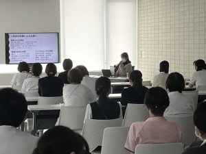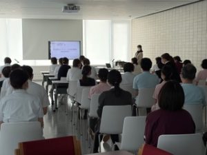 製薬会社より講師をお招きし、【感染症対策について】の題目で新型コロナウイルスの潜伏期間、平均日数、感染力インフルエンザと湿度、ノロウイルス、百日咳などについて研修しました。